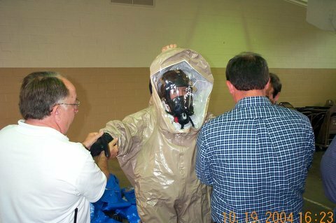 Sharon Green, RN is provided assistance as she dons her Level A suit for HazMat Technician certification.